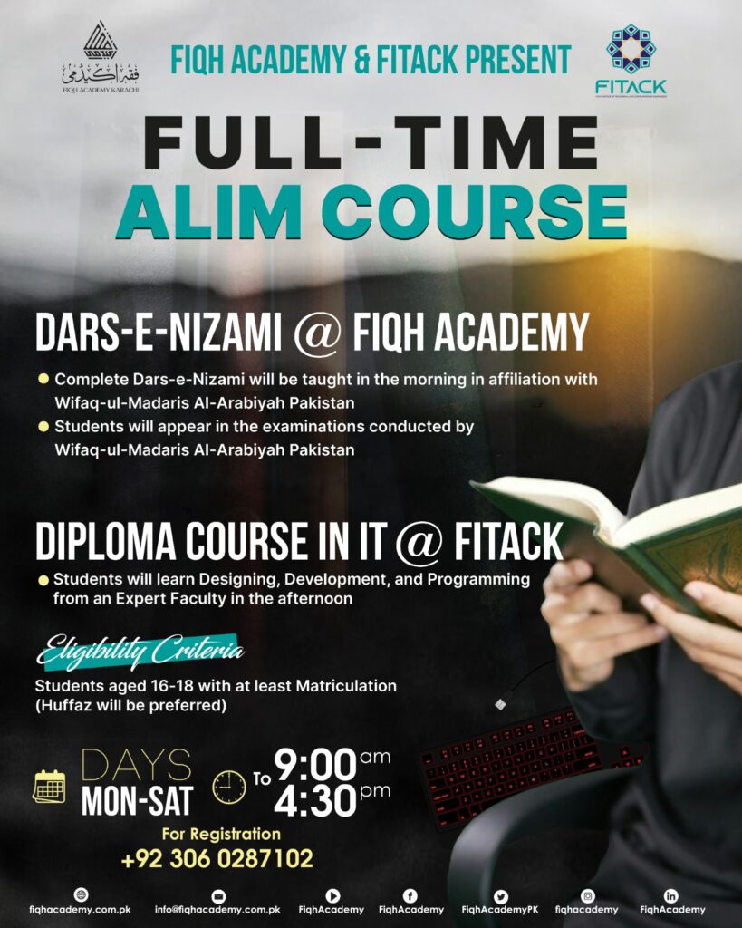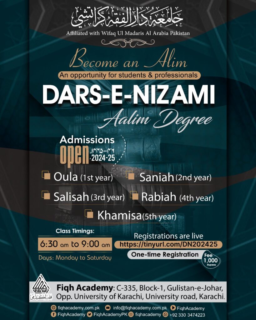 Fiqh Academy, founded in 2018 under the supervision of bona fide, classical Ulama and Mashaikh, is an Islamic Educational Institute in Gulistan-e-Jauhar Karachi. Its operations are managed by a team of Ulama, Talaba, and Volunteers educated in both Islamic as well as Contemporary Knowledge. This Institute adheres to the Religious Orientation of Akabir Ulama-e-Deoband i.e. the most eminent tradition of Ahl-us-Sunnah Wal Jama’ah present especially in the Sub-Continent, and strictly follows the Religious Rulings of Ulama-e-Deoband under Fiqh-e-Hanafi.